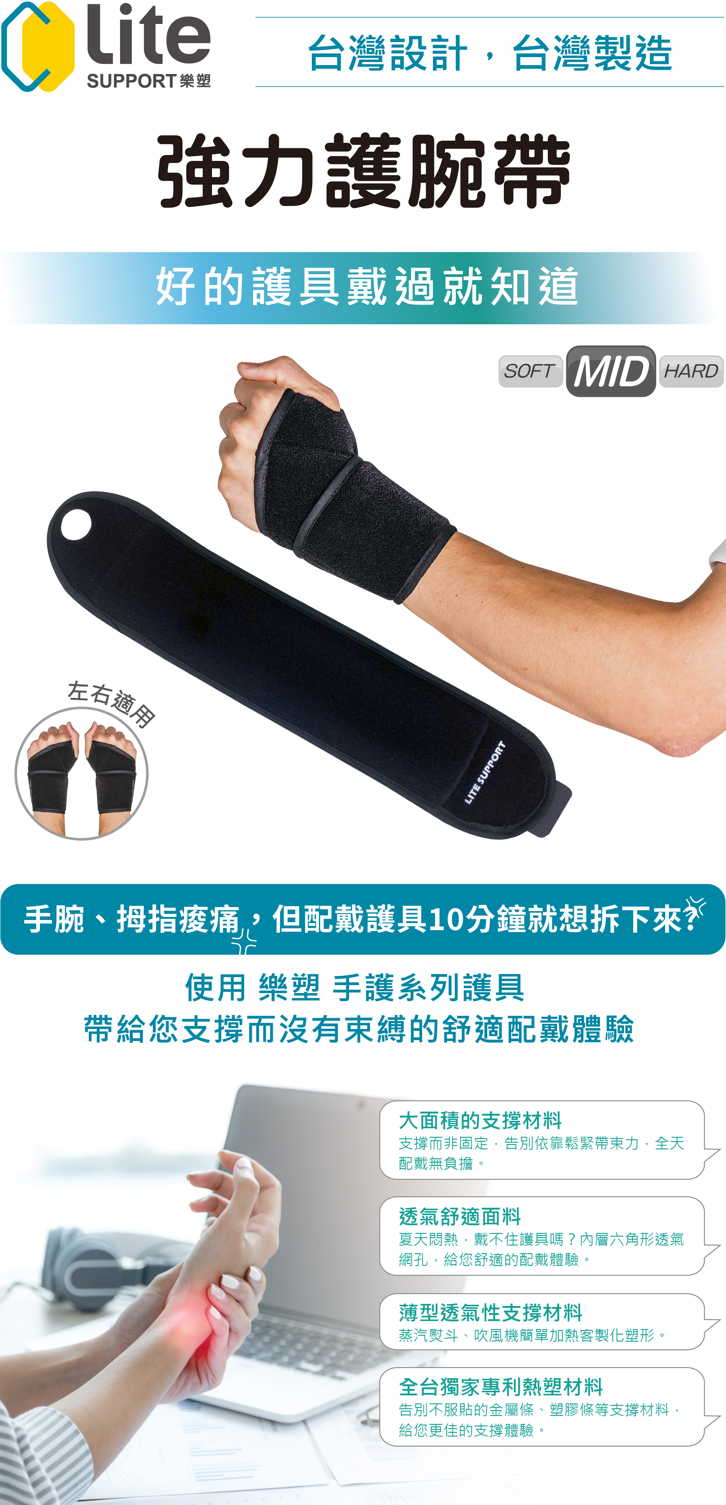 Lite SUPPORT 樂塑手護系列由獨家專利熱塑性材料與輕膚網布製作而成,其六角形網孔支撐結構,具高度透氣性,既輕巧且舒適。 通過使用吹風機或蒸氣熨斗,您可以輕鬆地軟化材料,並製成適合自己的客製化護具。