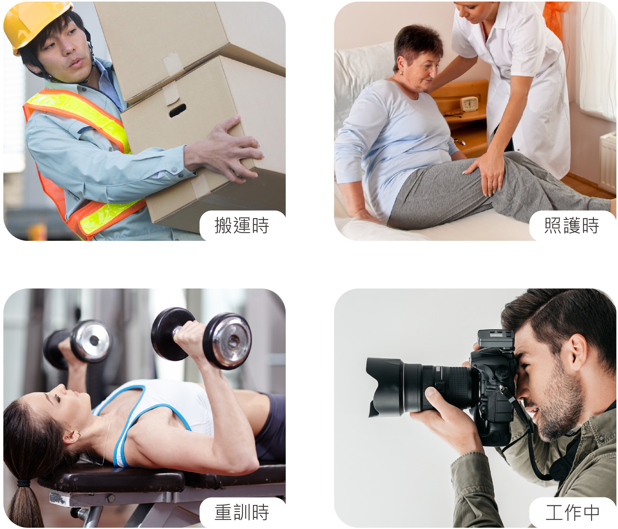 運動、舉重、重量訓練、搬運、固定、支撐。