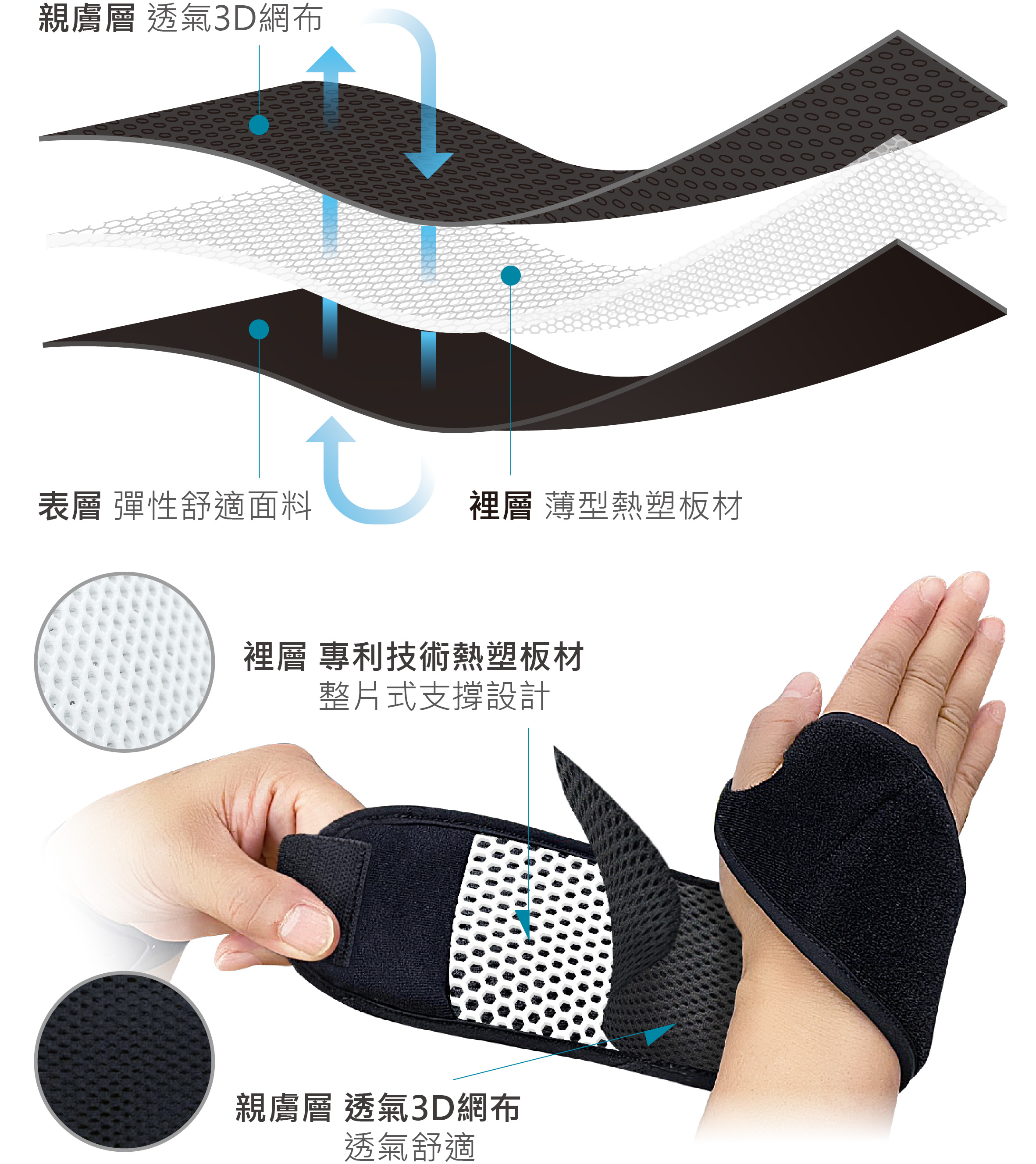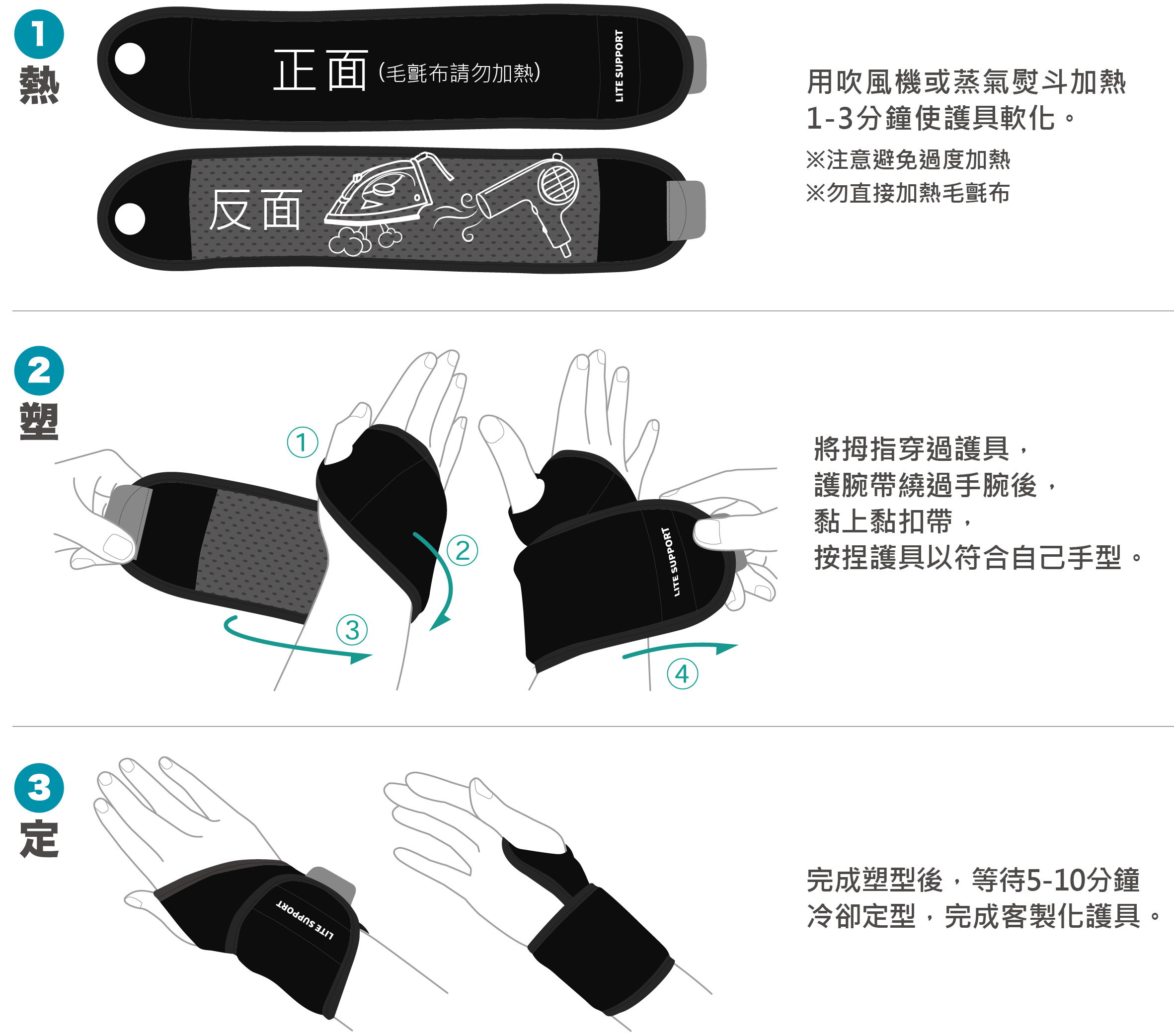 1. 內含熱可塑性支撐材料,可客製化塑型支撐手腕。
