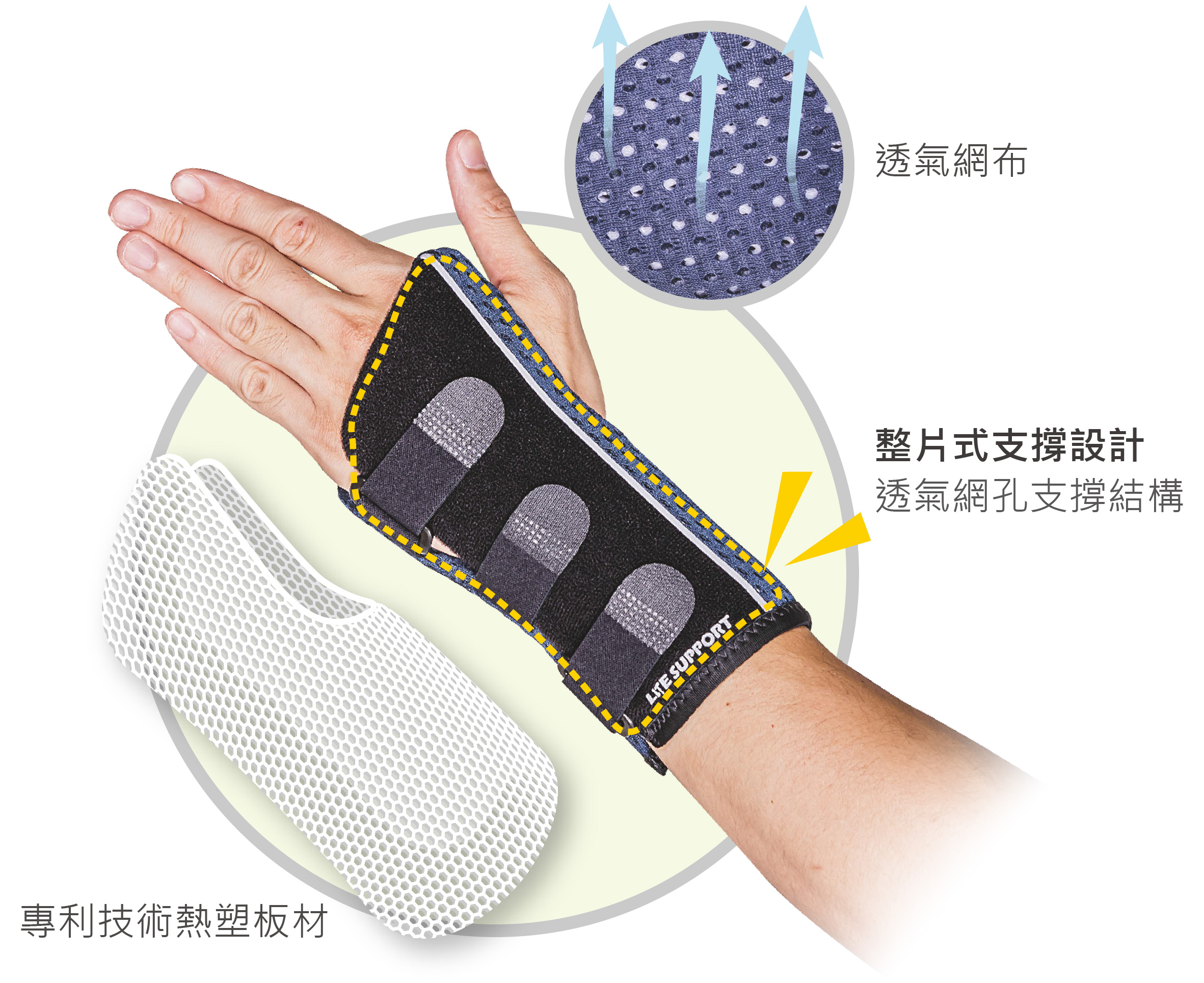 內含熱可塑性支撐材料,可客製化塑型支撐手腕。