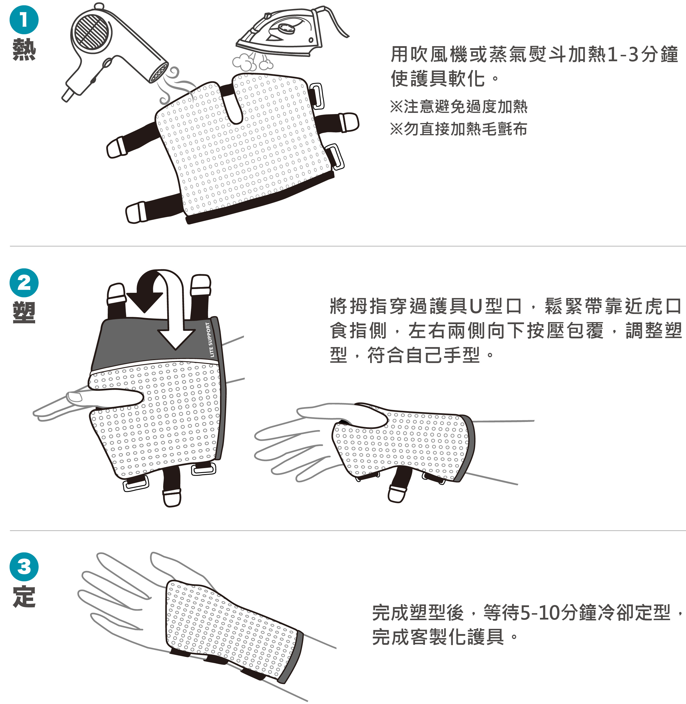 Lite SUPPORT 樂塑手護系列由獨家專利熱塑性材料與輕膚網布製作而成,其六角形網孔支撐結構,具高度透氣性,既輕巧且舒適。通過使用吹風機或蒸氣熨斗,您可以輕鬆地軟化材料,並製成適合自己的客製化護具。