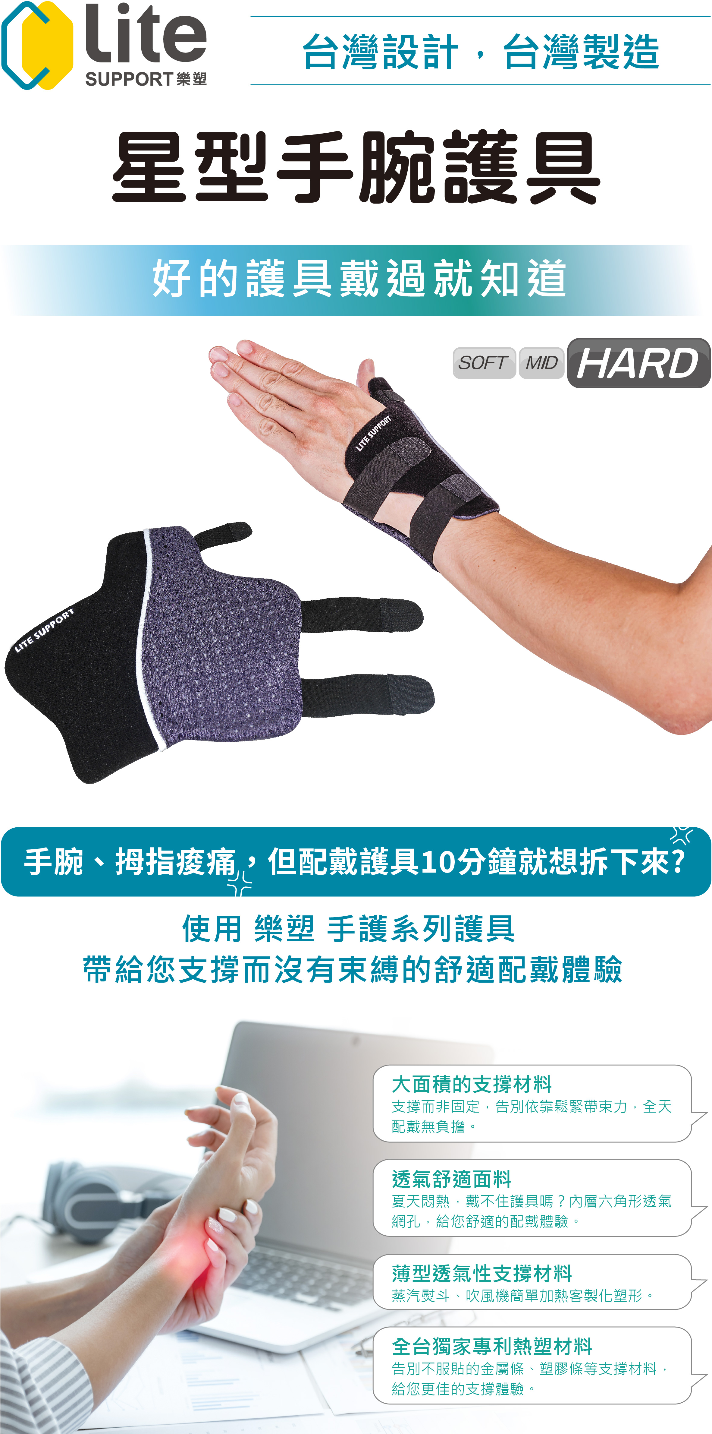 Lite SUPPORT 樂塑手護系列由獨家專利熱塑性材料與輕膚網布製作而成,其六角形網孔支撐結構,具高度透氣性,既輕巧且舒適。通過使用吹風機或蒸氣熨斗,您可以輕鬆地軟化材料,並製成適合自己的客製化護具。