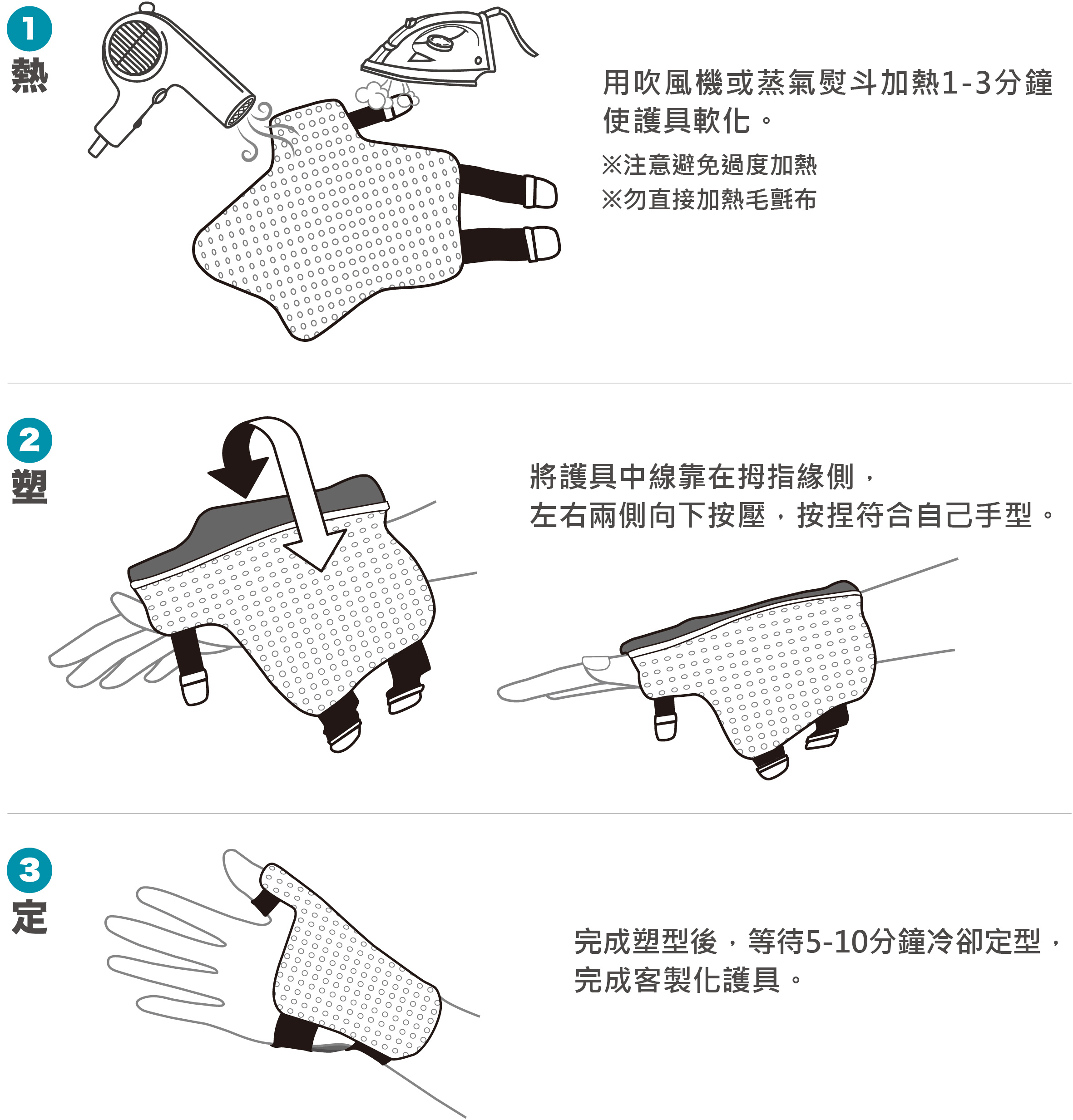 2. 定型後即可重複穿脫配戴,並可隨時局部或重新加熱塑型,以調整至最適形狀。