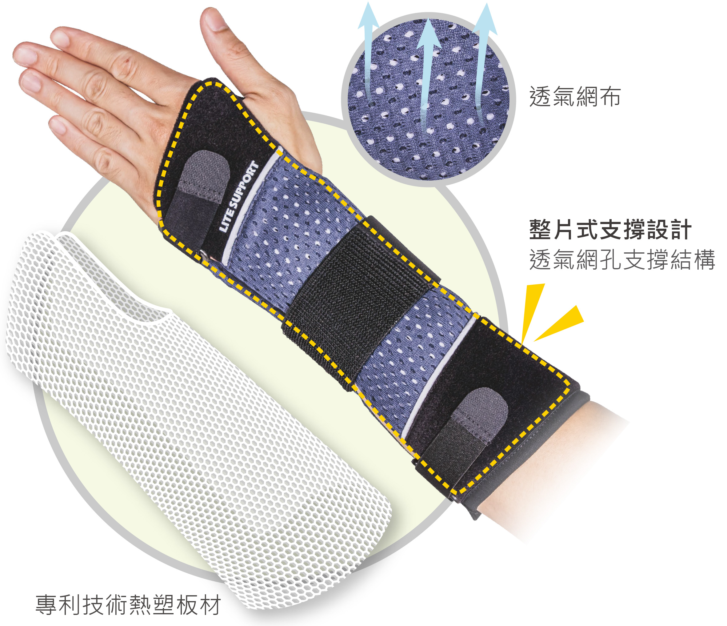 內含熱可塑性支撐材料,可客製化塑型支撐手腕。