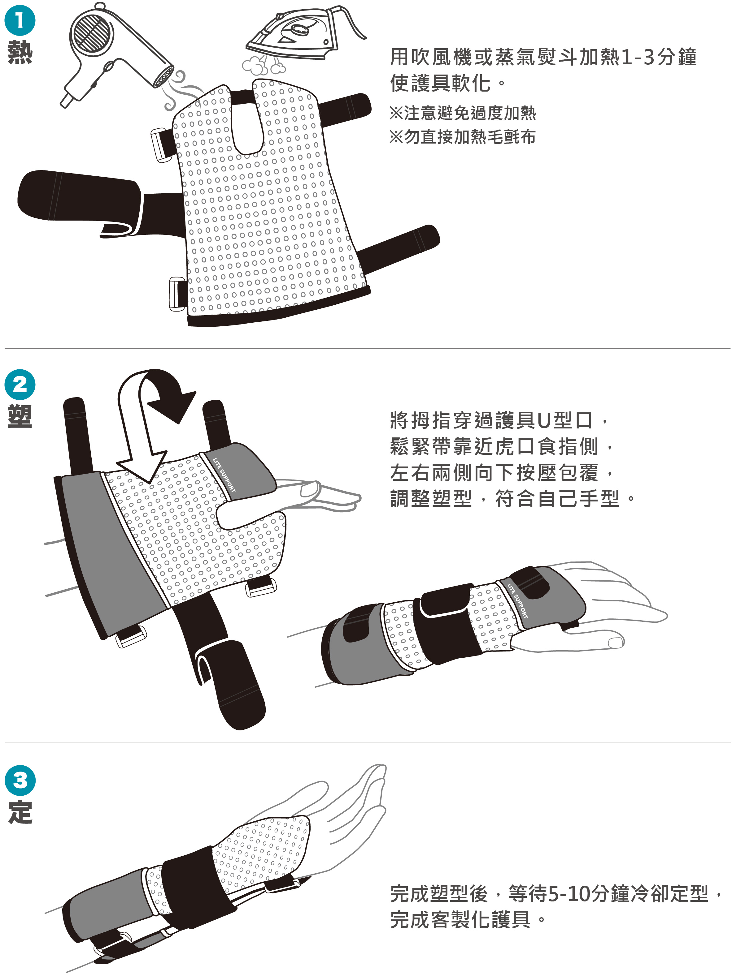 Lite SUPPORT 樂塑手護系列由獨家專利熱塑性材料與輕膚網布製作而成,其六角形網孔支撐結構,具高度透氣性,既輕巧且舒適。通過使用吹風機或蒸氣熨斗,您可以輕鬆地軟化材料,並製成適合自己的客製化護具。