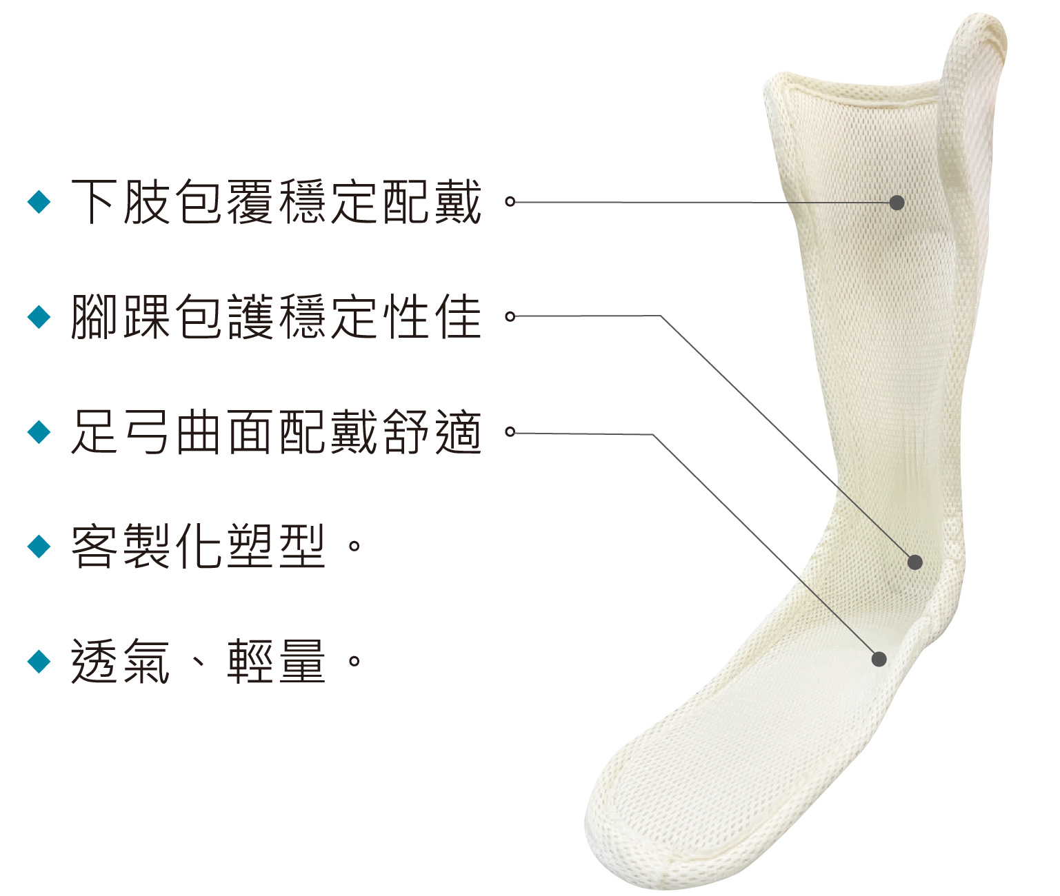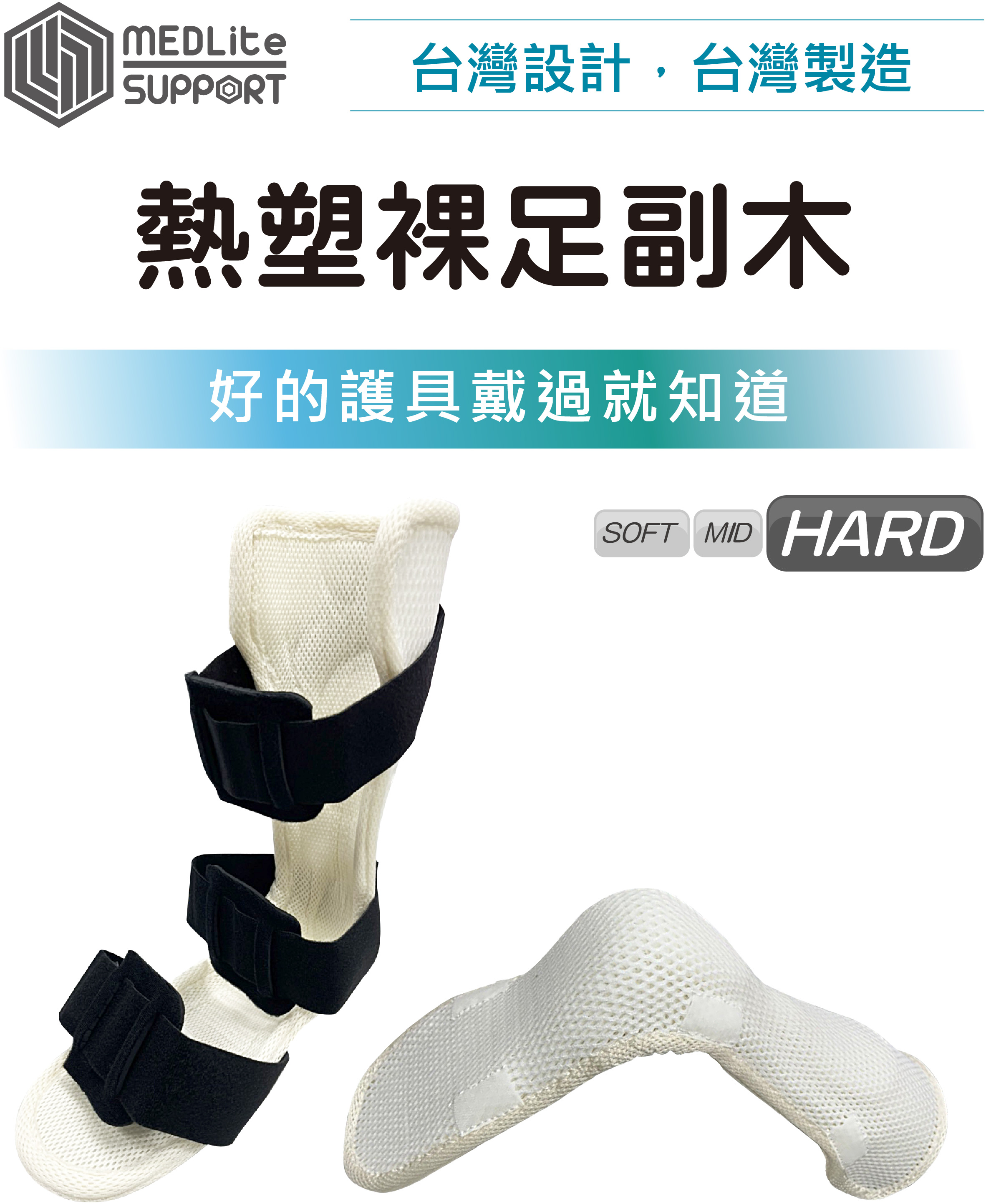 本產品使用MEDLite SUPPORT®熱塑板材 製作,使用吹風機局部加熱(>80℃),板材軟化後,可微調塑型,使踝足副木完全貼合患者腳型,可適用於 ◆ 預防足下垂 ◆ 足踝關節、腳掌受傷固定