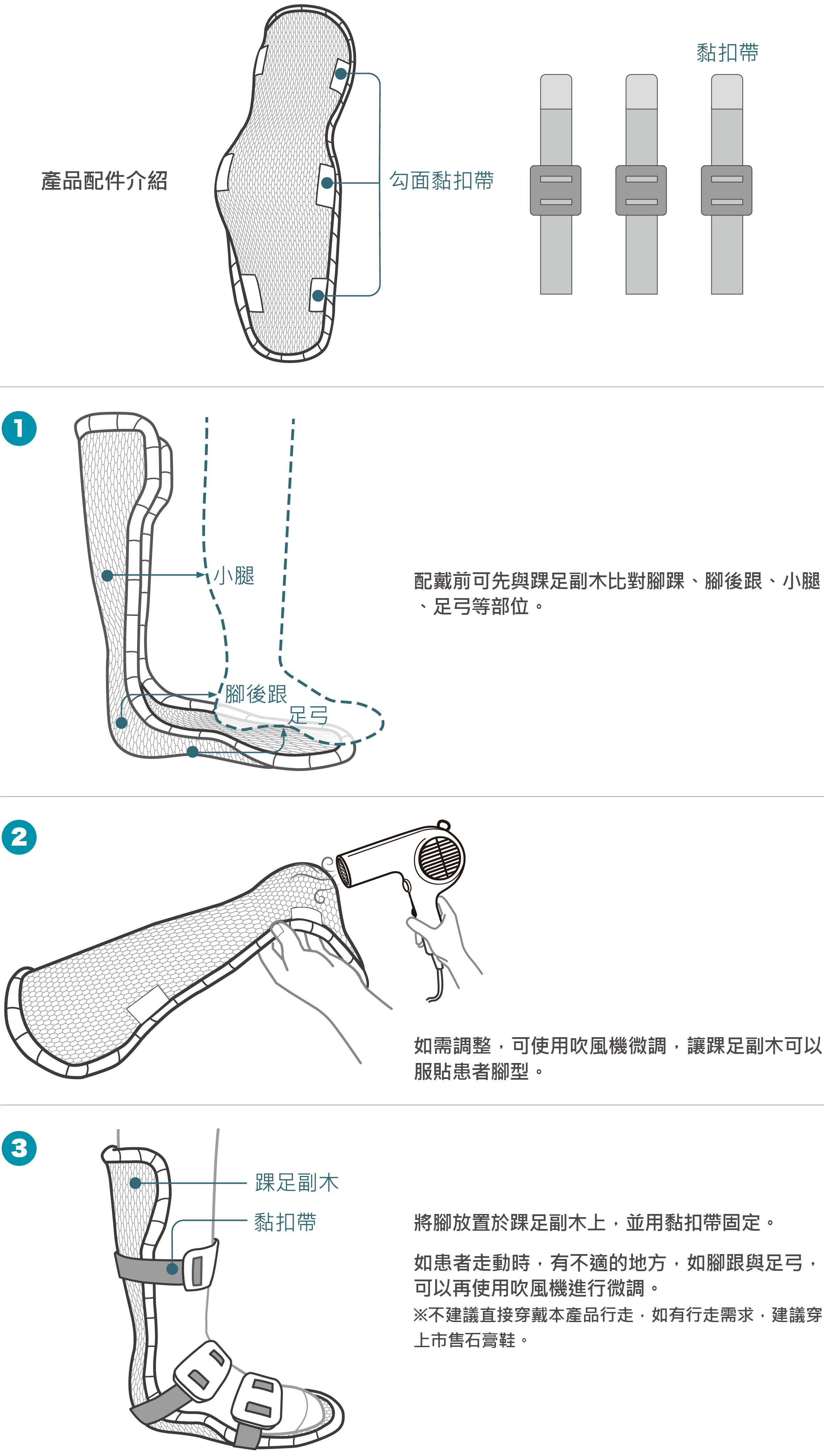 2. 避免將踝足副木浸於熱水裡,若要清理,可用濕布擦拭。